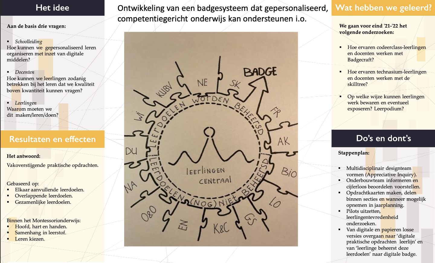 Het Metis Montessori wil het onderwijs meer richten op het ontwikkelen van vaardigheden in plaats van op het maken van eindprojecten. Met behulp van de innovatiegelden van het Samenwerkingsverband ontwikkelde de school daarom het badgesysteem.